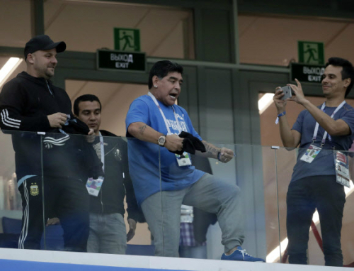 | 아르헨티나-나이지리아전을 지켜보던 전설 마라도나가 아르헨티나가 극적인 승리를 거두자 기쁨에 겨워 춤을 덩실덩실 추고 있다. 상트페테르부르크=AP 뉴시스 |