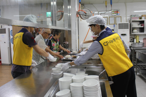 | CJ대한통운 건설부문 직원들이 방배노인종합복지관에서 배식 봉사 활동을 하고 있다. |