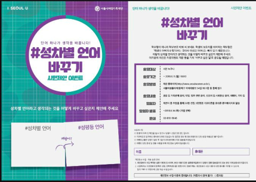 29일 서울시 여성가족재단은 서울시 성평등주간(7월 1∼7일)을 앞두고 흔히 사용하는 성차별 언어를 시민과 함께 개선하는 '단어 하나가 생각을 바꾼다! 서울시 성평등 언어사전' 캠페인 결과를 발표했다.