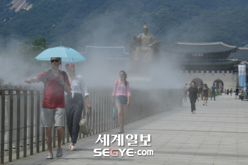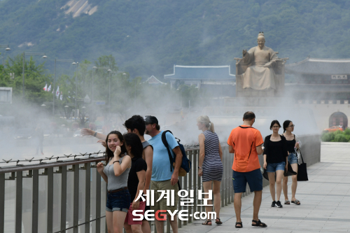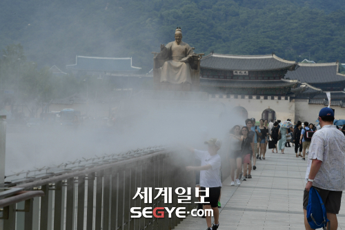 | 태풍이 물러가고 무더운 날씨가 이어진 4일 오후 서울 종로구 광화문광장에서 '쿨링포그'(Cooling Fog)가 가동되고 있다. 쿨링포그는 인공 안개비로 분사된 물이 공기와 만나면서 열을 빼앗아 주변 온도를 2~3도 낮추는 효과가 있다. |