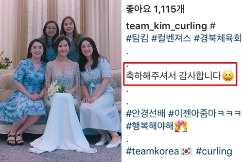 9일 '팀 킴'의 공식 사회관계망서비스(SNS) 인스타그램에는 김은정의 결혼식 대기실 단체 사진이 올라왔다.