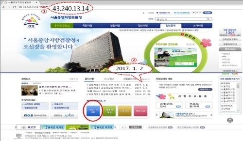 | 보이스피싱에 이용한 가짜 서울중앙지검 홈페이지. 홈페이지 주소를 보면 실제 홈페이지 주소(www.spo.go.kr)가 아닌 숫자로 돼 있고 홈페이지에는 예전 자료가 올라와 있다. 금융감독원 제공 |