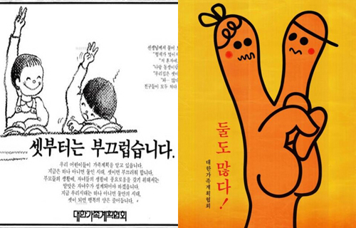 | 포스터로 살펴보는 인구정책 변화 1960년대에 ‘3·3·35운동(3명의 자녀를 3년 터울로 35세 이전에 단산하자)’으로 시작된 정부주도의 가족계획사업은 1986년 ‘하나 낳기 운동’으로 최고조에 달했다. 1990년대 포스터를 살펴보면 남아 선호로 인한 성비 불균형이 시급한 사안으로 급부상했음을 짐작할 수 있다. 다출산을 장려하는 정책은 2000년대에 이르러서야 비로소 등장했다. 자료: 보건복지부 |