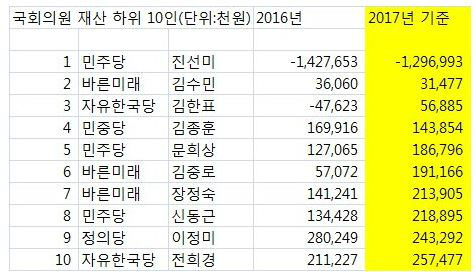 | '2017년 국회의원 재산 내역 하위 10위' 사진=국회 공직자윤리위원회 제공 |