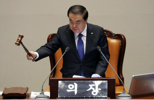 | 13일 서울 영등포구 여의도 국회에서 진행된 362회 국회(임시회) 1차 본회의에서 20대 국회 후반기 국회 의장에 당선된 문희상 의장이 본회의를 진행하고 있다. 사뉴시스 |