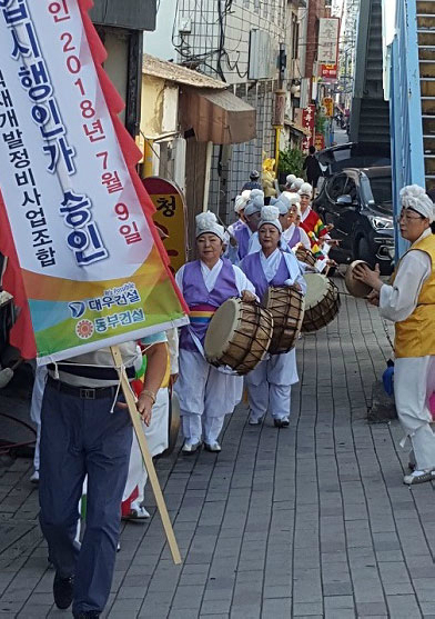 | 부산 남구 감만1동 주민 20명으로 구성된 사물놀이패가 16일 오후 마을을 한 바퀴 돌며 재개발사업 인가 승인을 자축하는 공연을 펼치고 있다. |