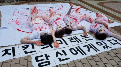 이들은 집회를 마친 뒤 닭 분장을 한 참가자들이 피투성이가 돼 쓰러지는 퍼포먼스를 벌였다.