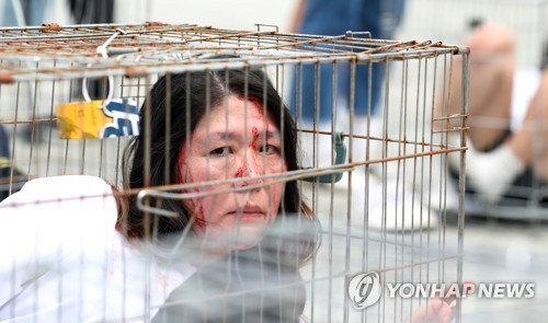 | 28일 서울 광화문광장에서 동물보호단체 케어 회원 등 동물권 활동가들이 개도살 금지를 호소하며 철창 퍼포먼스를 벌이고 있다. |
