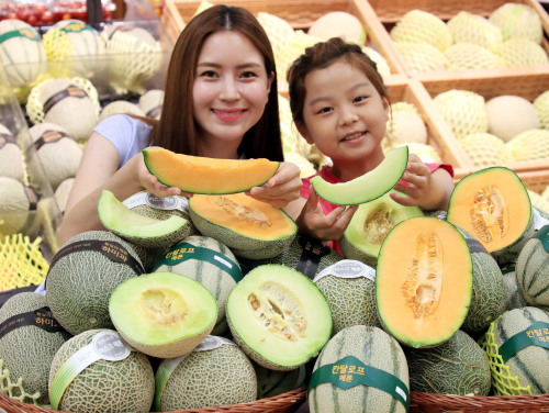 속 살이 노란 멜론 입력 : 2018-07-30 21:06:38 수정 : 2018-07-30 21:06:38 구글 네이버 유튜브 30일 롯데마트 서울역점에서 모델들이 국산 ‘칸탈로프 멜론’과 ‘머스크 멜론’을 선보이고 있다. 칸탈로프 멜론은 단면이 노란색으로 황산화 물질인 베타카로틴이 들어 있고, 단면이 초록색인 머스크 멜론은 당도와 칼륨 함량이 높다. <연합>연합> Copyright ⓒ 세계일보. 무단 전재 및 재배포 금지 연합