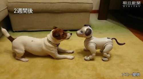 | 로봇개 행동을 따라 하는 강아지. 전문가는 아이보를 동물로 간주한 행동이라고 설명했다. |