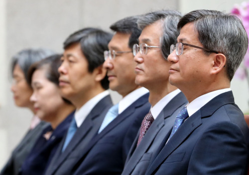 | 법원행정처가 '사법행정권 남용 의혹 관련 특별조사단'이 확보한 410개 행정처 문건 가운데 앞서 공개하지 않았던 196개(중복 32건 제외) 문건을 법원 내부와 언론에 공개한 가운데 1일 오전 서울 서초동 대법원 중앙홀에서 열린 '고영한, 김창석, 김신 대법관 퇴임식'에서 김명수 대법원장과 세명의 대법관이 기념촬영을 하고 있다. 뉴시스 |