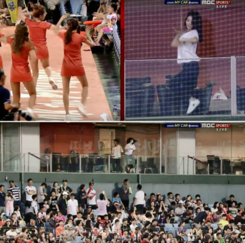 하지만 미주의 진정한 활약은 관중석에서 펼쳐졌다. 기존 아이돌 가수들이 시구를 마치고 곧바로 자리를 뜨는 것과 달리 관중석에 자리를 잡은 미주는 치어리더들의 춤에 맞춰 열정적인 댄스를 선보이기 시작했다.