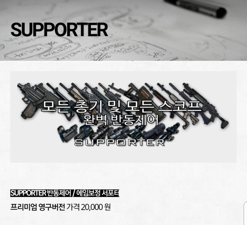 '반동제어서포터, 에임보정 서포터'라고 불리는 이 매크로를 소개한 유튜브 영상에는 27만명이 조회를 했다. 현재 이 메크로 프로그램은 2만원에 사용이 가능하다.