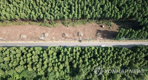 | 제주도가 지난 2일부터 8일까지 제주시 조천읍 대천동 사거리에서 금백조로 입구까지 2.9㎞에 이르는 비자림로 일부 구간에 대해 도로 확장공사를 진행하면서 삼나무숲을 베어 내자 환경 파괴 논란이 일고 있다. 제주=연합뉴스 |