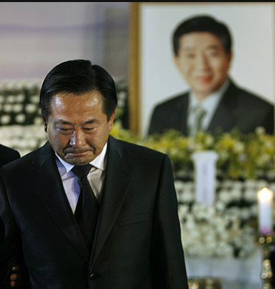 | 2009년 5월 25일 보석으로 풀려난 강금원 창신섬유 회장(노무현 후원회장)이 고 노무현 전 대통령을 조문한 뒤 눈물을 흘리며 돌아서고 있다. 뉴시스 |