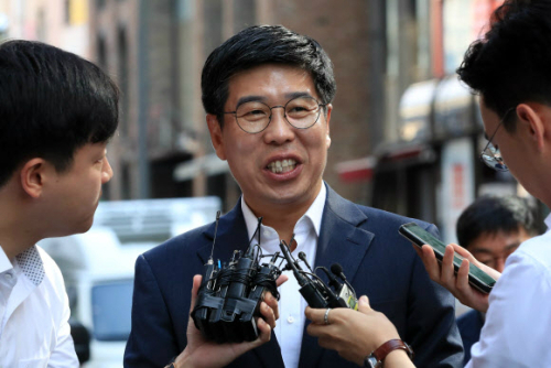 | 백원우 청와대 민정비서관이 15일 오전 8시45분 특검 사무실 앞에서 기자들의 질문에 답하고 있다. 백 비서관은 드루킹이 오사카 총영사로 추천한 도모 변호사를 지난 3월 면담한 것으로 알려졌으며 특검은 백 비서관을 상대로 김경수 경남지사의 추천이 있었는지를 살피고 있다. 연합뉴스 |