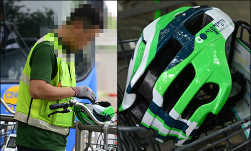 | 서울 여의도 지하철 5호선 여의나루역 1번 출구 앞 따릉이 관리 요원이 굵은 땀을 흘리며 바구니에 든 헬멧을 정리하고 있다. 사진=김경호 기자 |