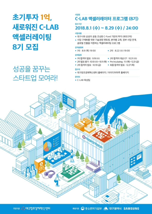 이번 8월 1일부터 모집을 시작한 C-LAB 8기는 8월 29일 수요일 자정까지 신청 가능하다. 8월 9일과 22일에는 설명회도 준비되어 있으며 세부 지원사항과 상세 공고 내용은 대구창조경제혁신센터 홈페이지에 게시된 공고문을 통해 확인 할 수 있다.