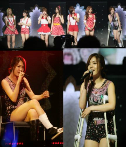 | 다리를 접질렀는데 깁스를 하지 않고 거동(왼쪽)하다 콘서트 장에서 깁스를 착용(오른쪽)했다며 논란을 불러 일으켰던 티아라 활동 당시 류화영. 사진=온라인 커뮤니티 사진 캡처 |