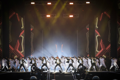 수십명의 백댄서와 함께 등장한 방탄소년단은 웅장하면서도 파워풀한 퍼포먼스를 동반한 최초 무대를 공개하는 자리임에도 아미팬들은 ‘떼창’으로 화답했다.