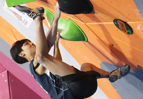 | 스포츠클라이밍 천종원이 26일 아시안게임 남자 콤바인 결선 볼더링 경기에서 암벽을 오르고 있다. 팔렘방=연합뉴스 |