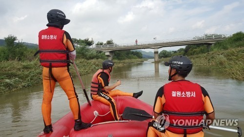 | 지난 29일 강원 철원군 갈말읍 지경리에서 주민 최모(68·여)씨가 실종돼 119대원들이 30일 최씨의 주택 인근 하천을 수색하고 있다. |