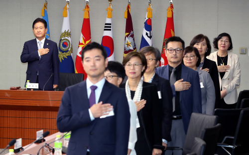 3일 서울 용산 국방부 청사에서 처음 열린 양성평등위원회 회의에서 정부 측 위원장을 맡은 서주석 국방부 차관(맨 왼쪽)과 민간위원들이 국기에 대한 경례를 하고 있다.