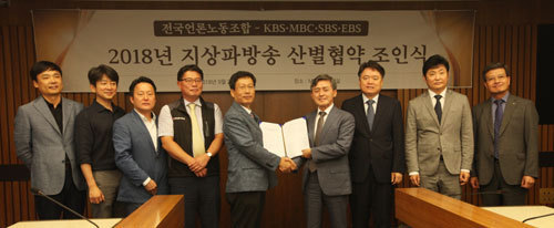 | 전국언론노동조합이 3일 오전 서울 마포구 MBC 사옥에서 지상파 방송 4사 (KBS, MBC, SBS, EBS)와의 산별협약을 체결하고 있다. 왼쪽부터 전국언론노조 윤창현 SBS본부장, 김연국 MBC본부장, 이경호 KBS본부장, 오정훈 수석부위원장, 김환균 위원장, 양승동 KBS사장, 최승호 MBC사장, 박정훈 SBS사장, 장해랑 EBS사장. 지난 6월 12일 상견례로 교섭에 들어간 이번 협약은 공정방송 실현, 방송 제작환경개선 및 장시간 제작 분야 특별대책 등을 담고 있다. 연합뉴스 |