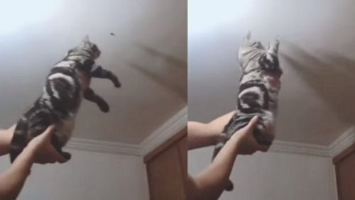 영상 속 주인은 고양이에게 대신 벌레를 잡게 하고 싶었는지, 고양이를 번쩍 들어 벌레가 앉아 있는 천장으로 향했다.
