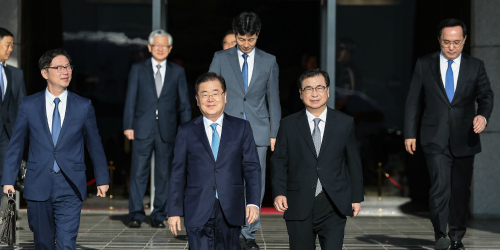| 정의용 청와대 국가안보실장을 수석으로 하는 문재인 대통령의 대북 특별사절단이 5일 오전 경기도 성남 서울공항을 통해 평양으로 출발하고 있다. 특사단 5명은 특별기를 타고 서울공항을 출발, 서해 직항로를 통해 방북한다. (왼쪽부터) 천해성 통일부 차관, 정의용 국가안보실장, 윤건영 청와대 국정상황실장, 서훈 국정원장, 김상균 국정원 2차장. 연합뉴스 |