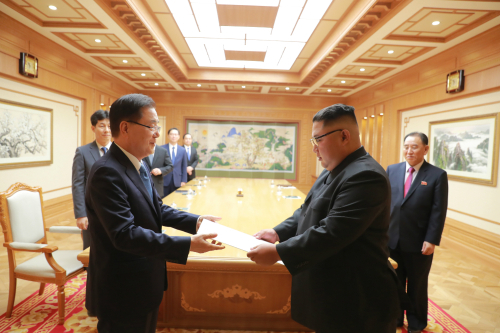 | 대북 특별사절단 단장인 정의용 국가안보실장이 5일 오후 평양에서 김정은 국무위원장에게 문재인 대통령 친서를 전달하고 있다. 사진=청와대 제공 |