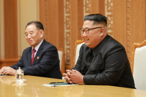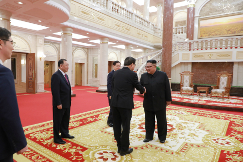 | 대북 특별사절단 단장인 정의용 국가안보실장을 비롯한 특사단이 5일 오후 평양 노동당 본부청사에서 김정은 국무위원장을 접견하고 있다. 사진=청와대 제공 |