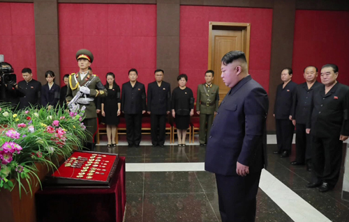 | 16일 만에 모습 드러낸 김정은 김정은 북한 국무위원장이 최근 사망한 주규창 전 조선노동당 기계공업부 부장의 빈소를 찾아 애도했다고 조선중앙TV가 5일 보도했다. 사진은 김 위원장이 고인이 생전에 받았던 훈장들을 지켜보고 있는 모습. 김 위원장의 공개활동이 북한 매체에 보도된 것은 지난달 21일 묘향산의료기구공장 현지지도 이후 16일 만이다. 연합뉴스 |