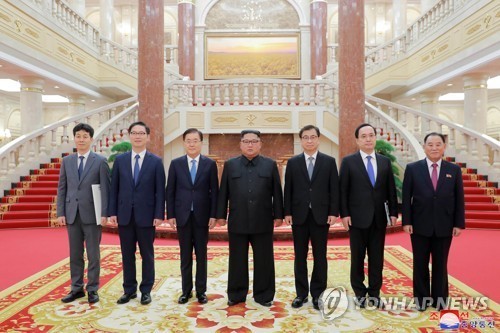| 북한 김정은 국무위원장이 지난 5일 평양을 방문한 문재인 대통령의 대북 특별사절단을 노동당 중앙위원회 본부청사에서 접견했다고 조선중앙통신이 6일 보도했다. 왼쪽부터 윤건영 청와대 국정상황실장, 천해성 통일부 차관, 정의용 국가안보실장, 김정은 국무위원장, 서훈 국정원장, 김상균 국정원 2차장, 김영철 노동당 중앙위 부위원장 겸 통일전선부장. |