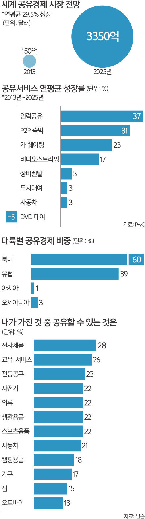 7일 글로벌 컨설팅업체인 프라이스 워터하우스 쿠퍼스(PwC)에 따르면 2013년 150억달러(약 16조8525억원) 수준이던 세계 공유경제 시장은 2025년 3350억달러(약 376조3725억원)로 늘어날 전망이다. 공유경제는 합리적인 소비와 자원의 낭비를 줄인다는 평가를 받으며 고속 성장을 질주하고 있다.