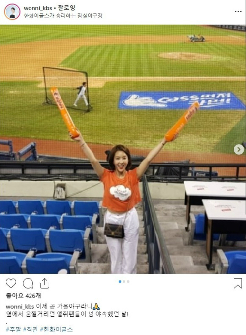 지난 9일 정지원 아나운서는 자신의 SNS에 잠실야구장을 다녀온 사진을 게재했다. 이날 경기는 홈팀 LG트윈스가 원정팀 한화이글스를 8-5의 스코어로 승리했다.