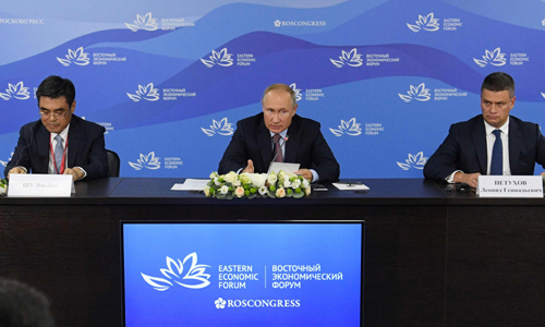 | 11일 러시아 극동 블라디보스토크에서 개막한 '동방경제포럼'에서 블라디미르 푸틴 대통령(가운데)이 기업인들과의 회동 모임을 주재하고 있다. 사진=AFP·연합뉴스 |