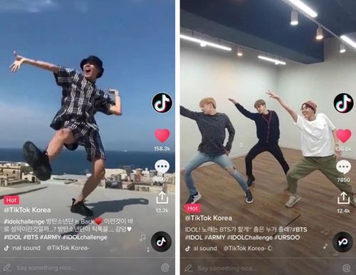| 방탄소년단 제이홉(사진 왼쪽)이 '틱톡'으로 직접 찍은 '아이돌' 안무영상을 보고 따라하는 챌린지 열풍이 SNS상에서도 거세게 불고 있다. |