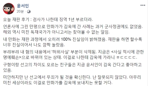 | 윤서인이 검찰의 징역 1년 구형에 후기를 전했다. |