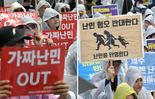 제주도에 들어온 예멘인들의 대규모 난민신청과 관련한 논란이 계속되는 가운데 16일 서울 도심에서 난민 찬반 집회가 동시에 열렸다.
