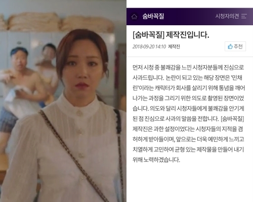 제작진은 "시청 중 불쾌감을 느낀 시청자분들께 진심으로 사과드립니다"라고 하며 "논란이 되고 있는 해당 장면은 '민채린'이라는 캐릭터가 회사를 살리기 위해 통념을 깨어 나가는 과정을 그리기 위한 의도로 촬영된 장면"이라고 설명했다.