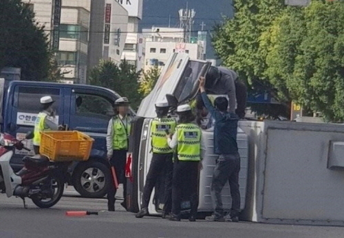 30일 경찰 등에 따르면 해당 사진은 지난달 28일 오후 2시55분 부산 연제구 연산로터리 부근에서 벌어진 교통사고 현장 모습인 것으로 드러났다. 당시 신호를 위반한 흰색 라보 차량이 파란색 포터 차량을 들이받은 뒤 왼쪽으로 넘어진 것으로 알려졌다.