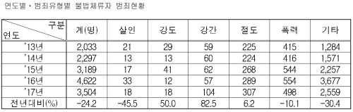 2013년 21명이었던 불법체류자 살인 피의자는 2016년 33명까지 증가하다 지난해 18명으로 감소했고, 강도는 2013년 29명이었다 2016년 12명에서 지난해 18명으로 증가했다. 강간 피의자의 경우 2013년 59명에서 2016년 57명, 지난해 104명으로 급증했다. 절도는 2013년 225명에서 2016년 289명, 지난해 307명으로 증가했고, 폭력범은 2013년 415건에서 2016년 554명, 지난해 498명으로 감소했다.