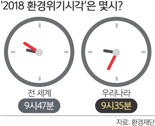 우리나라 환경위기시계도 지난해(9시9분)보다 26분 흐른 9시35분을 가리켰다.