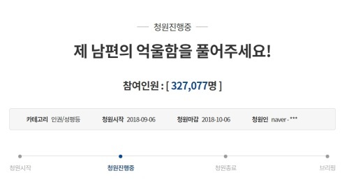 ‘제 남편의 억울함을 풀어주세요’라는 제목의 청원에서 청원자는 자신의 남편이 억울하게 징역 6개월을 선고받고 법정 구속됐다며 말문을 열었다. 그녀는 “성적인 문제는 남자가 너무나도 불리하게 되어있는 우리나라 법! 그 법이 저희 신랑에게 제발 악용되지 않게 억울함 좀 풀어 달라”고 요청했다.