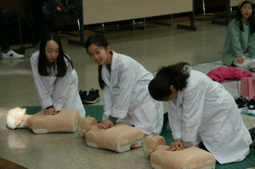 | 학생들이 심폐소생술 교육을 받고 있는 모습. |