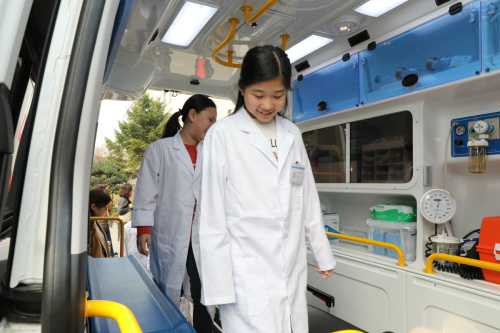 | 병원체험에 참가한 학생들이 구급차 내부를 둘러보고 있다. |