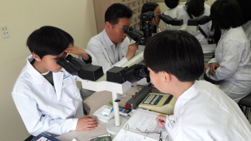 | 학생들이 현미경을 통해 혈액검사를 체험하는 장면. |