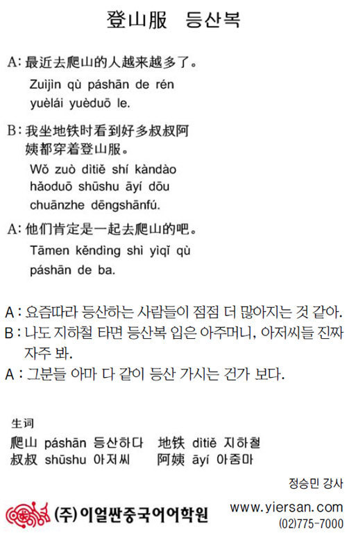 [이얼싼 중국어 회화] 등산복 입력 : 2018-10-16 19:21:37 수정 : 2018-10-16 19:21:36 구글 네이버 유튜브 Copyright ⓒ 세계일보. 무단 전재 및 재배포 금지 세계일보