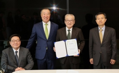 | 한국후견협회가 오는 23∼25일 개최하는 제5회 ‘세계성년후견대회’ 홍보대사로 배우 이순재를 위축한 뒤 기념촬영을 하고 있다. 왼쪽부터 법무법인 율촌 박은수 고문, 한국후견협회 소순무 협회장, 배우 이순재, 율촌 오지철 고문. 한국후견협회 제공 |